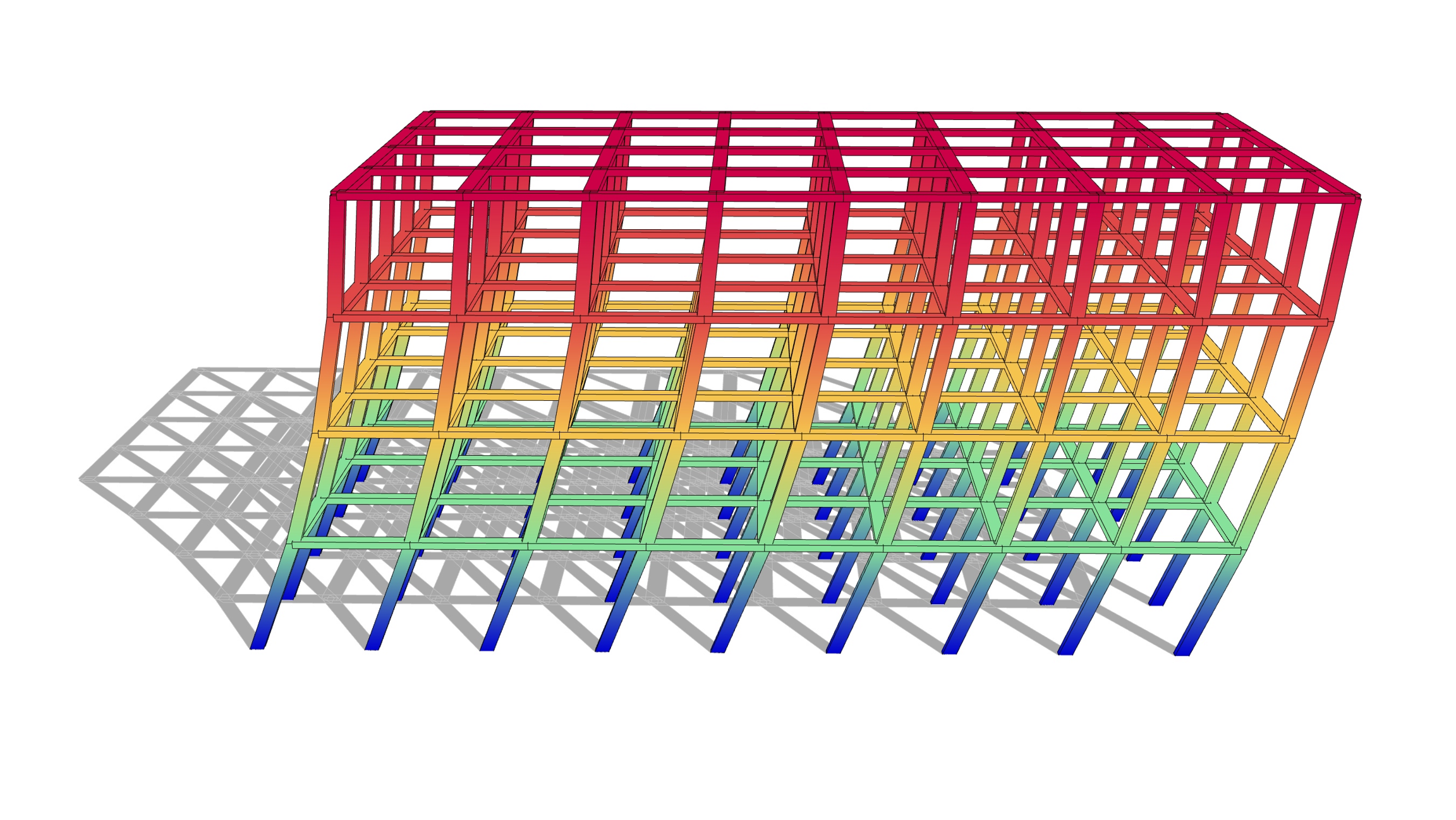 This example shows a typical multi‑storey building model built from beams, columns, slabs and diaphragms. Use it to understand the overall Alpaca4d workflow for real‑scale buildings: defining geometry, assigning sections and materials, applying loads, creating load patterns and running global analyses.